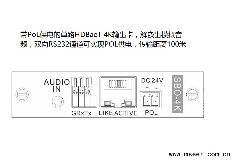 SBO-4K HDBaseT單通道4K輸出卡(兼容2K),配合SMD主機使用,采用獨立板卡設計,每塊卡支持1路HDBaseT輸出,可加嵌入模擬音頻,雙向RS232通道可實現(xiàn)POL供電,傳輸距離100米,支持最高3840ⅹ2160P30的數(shù)字高清圖像傳輸.