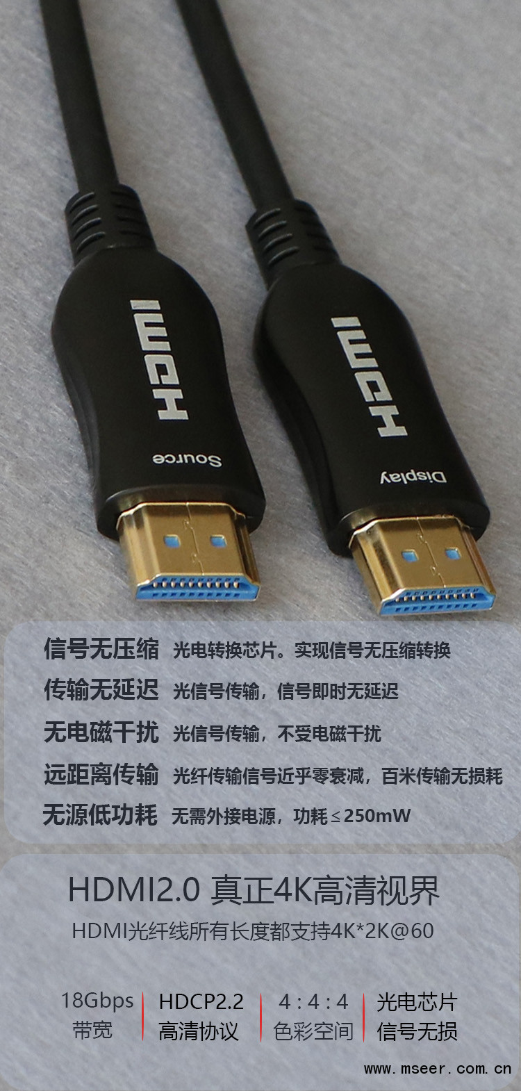 HDMI光纖符合2.0規范,傳輸速率可達到18G,可以支持 4K@60Hz畫質以及 4:4:4傳輸效果;向下兼容2K&1080P&3D等畫質。信號衰減小于0.0035db/米,突破傳統銅纜傳輸距離受限制的瓶頸,可以實現150米的遠距離傳輸。