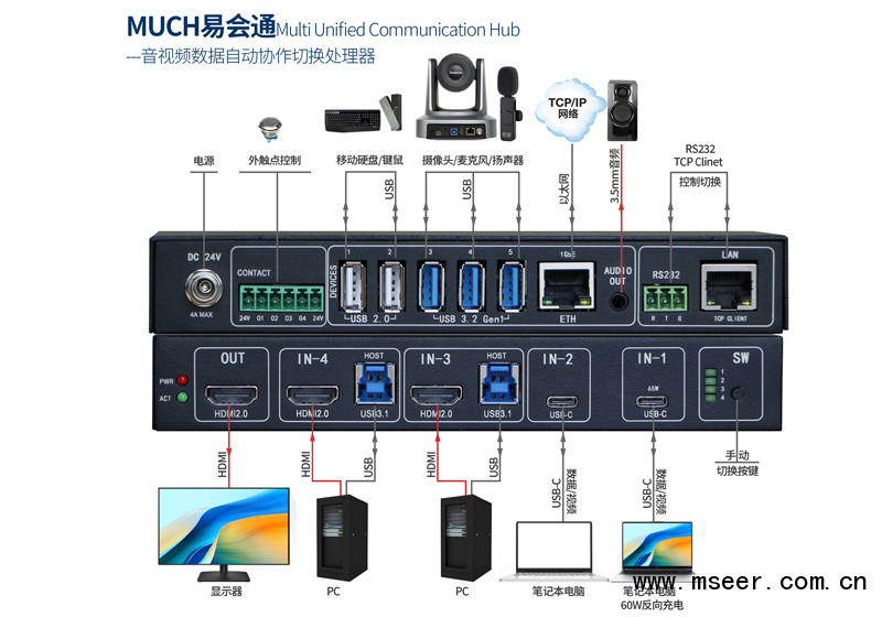 MUCH易會(huì)通具備豐富的接口,涵蓋 HDMI、USB(USB-A、USB-B、USB-C)以及千兆網(wǎng)口等常用辦公設(shè)備接口,滿足多種場(chǎng)景下的多媒體協(xié)作應(yīng)用需求。設(shè)備支持 4 路輸入(2 路 HDMI 含 USB數(shù)據(jù),2 路 USB-C)和 1 路 HDMI 4K 輸出。其中 1 路 USB-C 輸入支持最大 60W PD反向供電。